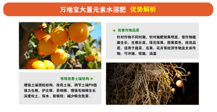 万地宝大量元素水溶肥料采用磷酸二氢钾或矿源黄腐酸钾为原料,特别添加海藻酸与螯合微量元素,根据作物生长阶段所需营养设计配方,适合多种施肥方式,省时省力。